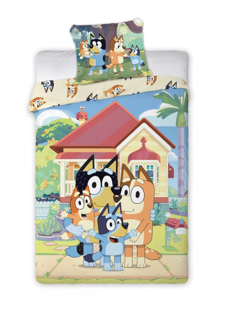Családi Bluey mintával az elején, és kisebb mintával a takaró huzat hátoldalán.